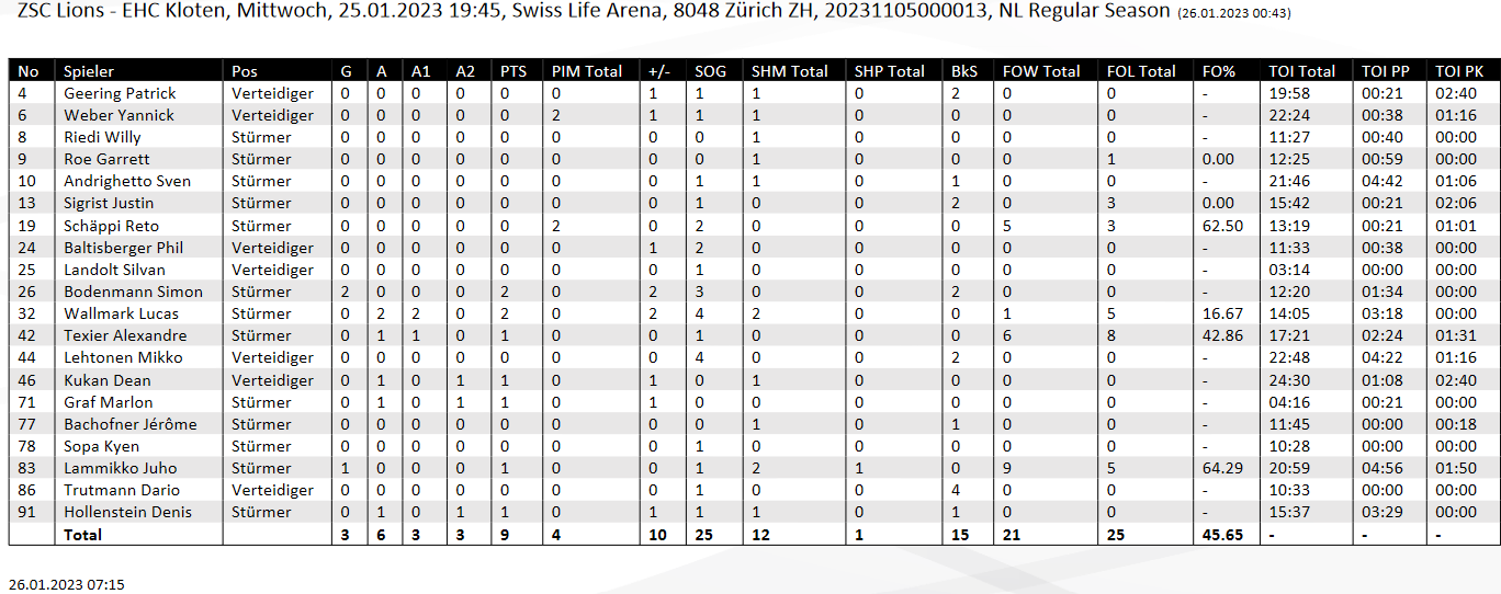 • Verdienter Sieg für den ZSC, trotz bescheidener Leistung. Kloten zu schwach und mangelnde Spielauslösung. Das 1-0 und die Strafe inkl. Kopftreffer haben das Spiel entschieden, meine Hoffnung in eine nachvollziehbare Torraumregel habe ich aufgegeben. Am Besten wieder abschaffen.