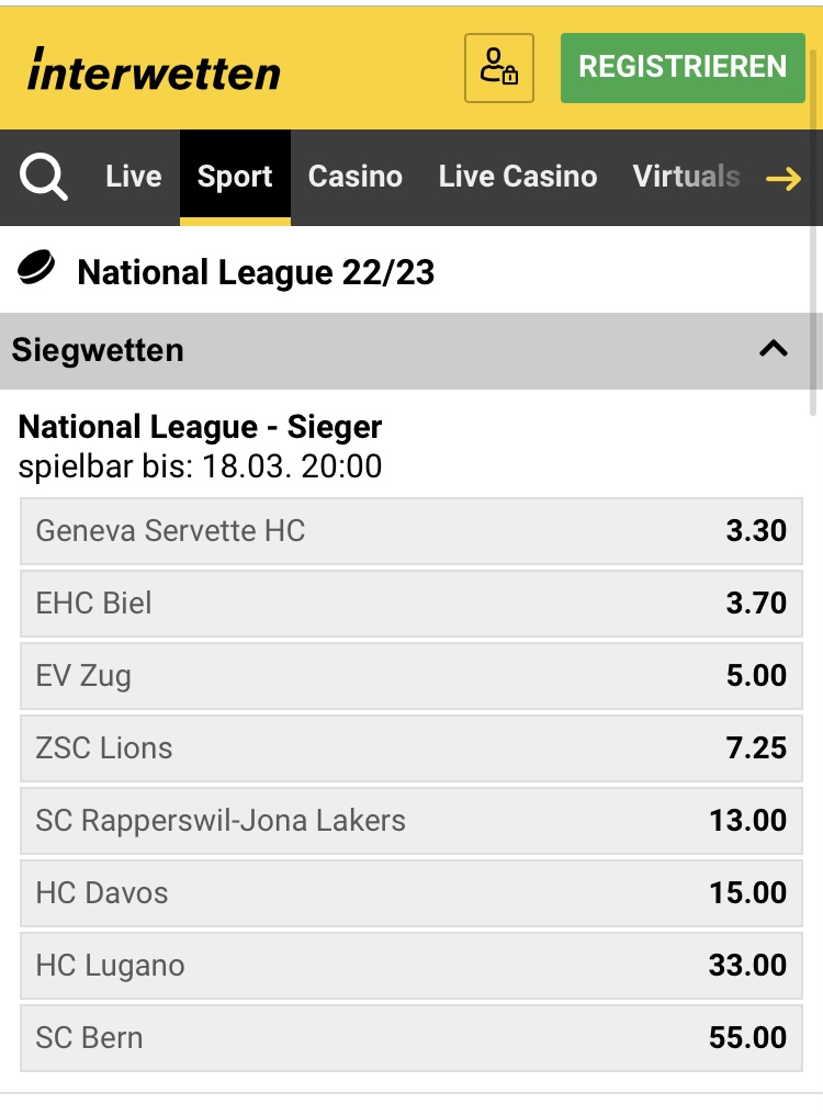 Bei Interwetten sind ZSC/Zug sogar auf 7.25 -