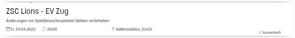 Falls jemand den Match vom 11. Oktober (ZSC-Ambri) nicht besucht, ich wäre dankbarer Abnehmer zweier Sitzlätze nebeneinander.